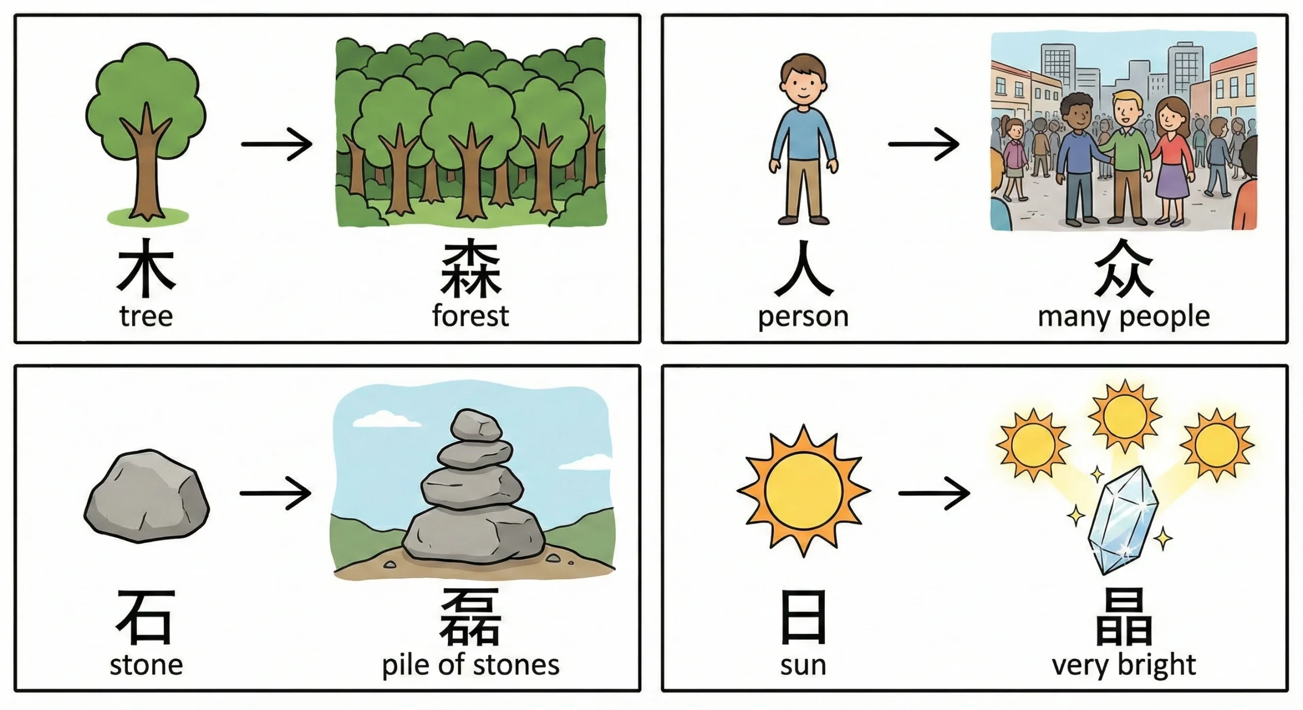 “森” → three trees (木) together → a forest