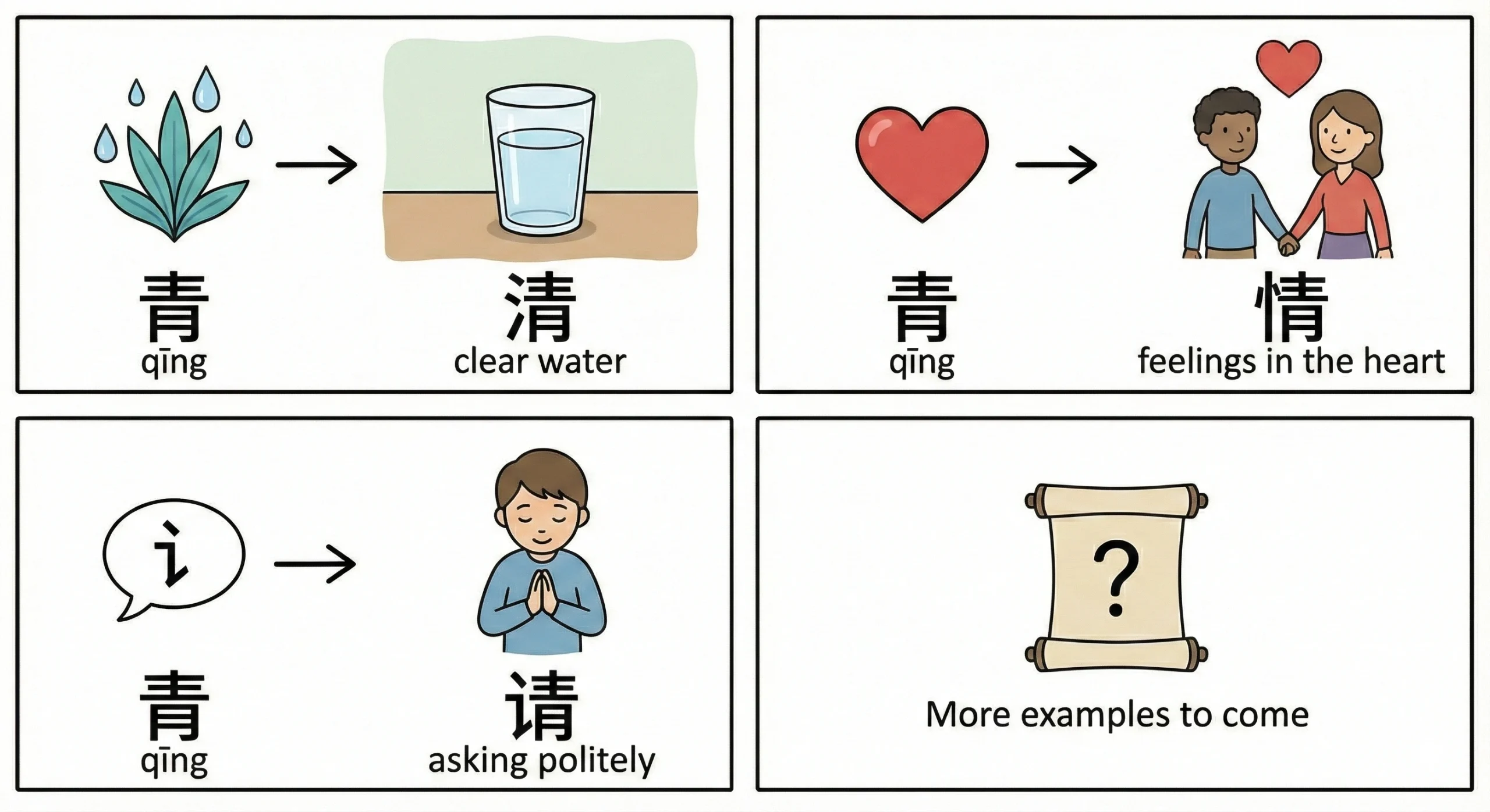 For example, “清”: 清水 (clean water), 清楚 (clear), 清晨 (early morning)