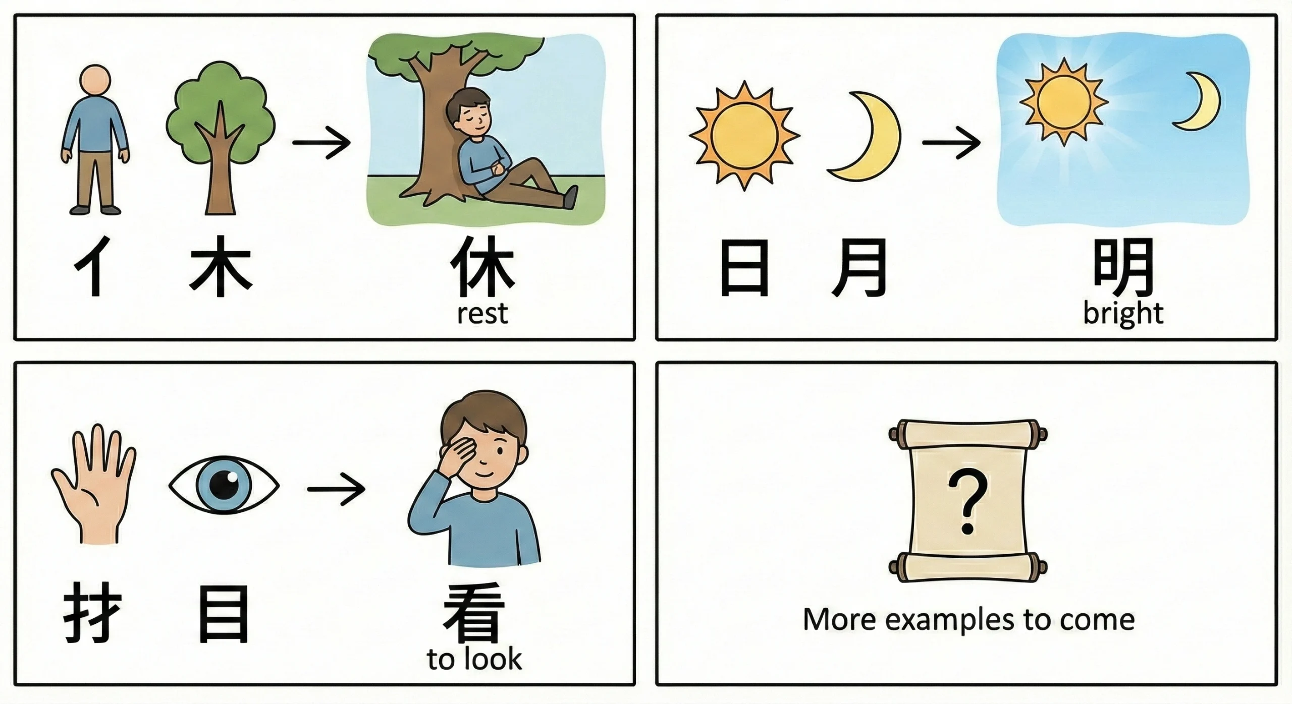 Observe how the characters are used in different contexts
